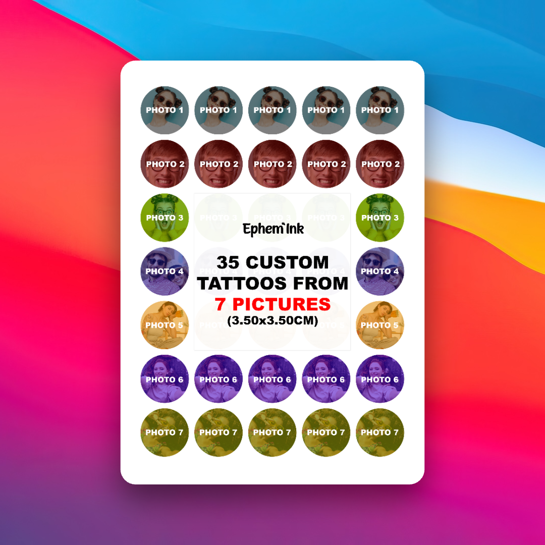 Dieses Set enthält 35 personalisierte temporäre Tattoos, erstellt aus sieben verschiedenen Fotos. Jedes Motiv wird fünfmal gedruckt und ergibt ein harmonisches, vielseitiges Tattoo-Set, das Ihre schönsten Momente auf kreative Weise zum Ausdruck bringt.