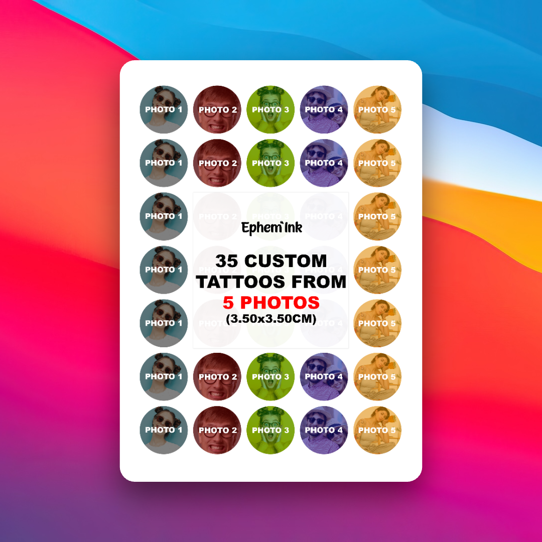 Dieses Set enthält 35 personalisierte temporäre Tattoos, erstellt aus fünf verschiedenen Fotos. Jedes Motiv wird siebenmal gedruckt und ergibt ein harmonisches, vielseitiges Tattoo-Set, das Ihre schönsten Momente auf kreative Weise sichtbar macht.